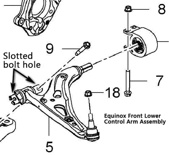 माथिको छविले शेभरलेट इक्विनोक्सको लागि अगाडिको तल्लो नियन्त्रण आर्म असेंबली देखाउँछ। बाणले बुशिङ एसेम्बली भित्रको ओपन-बोल्ट होल संरचनालाई संकेत गर्छ।