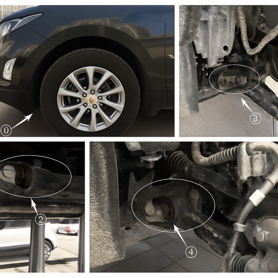 तस्बिरहरूको अघिल्लो सेटले शेभरलेट इक्विनक्समा फ्रन्ट सस्पेन्सन कन्ट्रोल आर्म बुशिंग विफलताको संरचनात्मक अवस्थालाई चित्रण गर्दछ। यसले प्रयोगकर्ताहरूलाई सल्लाह दिन्छ कि, माथिको रेखाचित्रमा देखाइए अनुसार, सम्भावित विफलताको साथ संरचनात्मक कम्पोनेन्ट स्टेरिङ् ह्विललाई ① स्थितिमा पूर्ण लकमा घुमाएर निरीक्षण गर्न सकिन्छ। बुशिङ असेंबलीको सुरक्षा प्रमाणीकरण पोजिसन ②, , र ④ सहित धेरै स्थानहरूमा खिचिएका तस्बिरहरू मार्फत सञ्चालन गरिनुपर्छ।