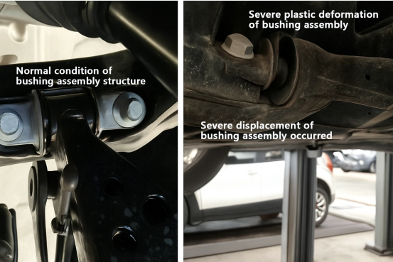 सामान्य रूपमा काम गर्ने कन्ट्रोल आर्म बुशिङ एसेम्बली (तल्लो-बायाँ छविमा देखाइएको जस्तै) र दोषपूर्ण बुशिङ एसेम्ब्ली (तल्लो-दायाँ छविमा देखाइए अनुसार) बीच तुलना गरिन्छ। उनले औंल्याए कि तलको बायाँ र दायाँ छविहरू तुलना गरेर, यो देख्न सजिलो छ कि बायाँमा सामान्य नियन्त्रण हात बुशिङमा अन्तर समान छ, र दायाँ छविमा देखाइएको रूपमा कुनै स्पष्ट झुकाउने वा विकृति हुनु हुँदैन। यदि सवारी साधनले सही छविमा देखाइएको अवस्था देखाउँछ भने, यसले पहिले नै सञ्चालनको क्रममा सुरक्षा खतरा उत्पन्न गर्छ।