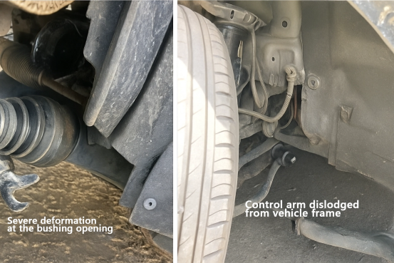 यसको ओपन-डिजाइन कन्फिगरेसनको कारणले, नियन्त्रण आर्म बुशिङले विरूपण अनुभव गर्न सक्छ वा निश्चित लोड प्रभावहरू अन्तर्गत विस्थापन पनि हुन सक्छ। यस्तो विफलताले सम्भावित रूपमा दुर्घटना क्षति बिग्रन सक्छ र सुरक्षा खतरा निम्त्याउन सक्छ।